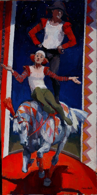 'Equi-Librium' shows the balance and poise of circus performers and their horse. Strong contrasts of colour, light and shade give depth and substance to the moment captured in this modern oil painting.