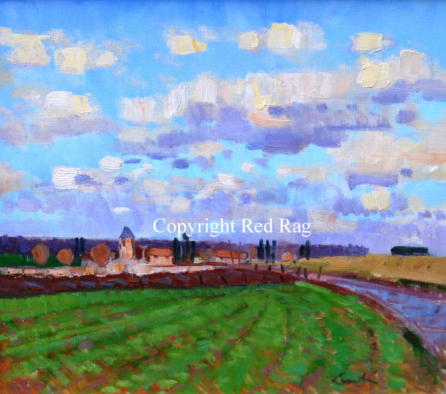 In 'Cherence' we are drawn into the painting and towards the small Normandy village along lines of green vegetation. A stream sparkles at one side and adds to the rich array of colour, texture and light portrayed in the painting. This is a strong painting showing George Devlin's bold brushwork and clear compositional style.