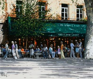 dappled sunlight in the empty square in the foreground. Jeremy Barlow excels in his evocative atmospheric representation of café life in Provence. Jeremy Barlow travels extensively and delights and in painting such wonderfully evocative scenes. He creates an impressive interaction of light and dark and strong contrast of deep, rich shadows with pools of bright sunlight.