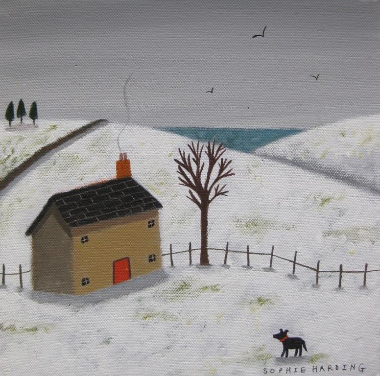 Modern British Art Artist: Sophie Harding Painting: Cottage, Snow and Black Dog