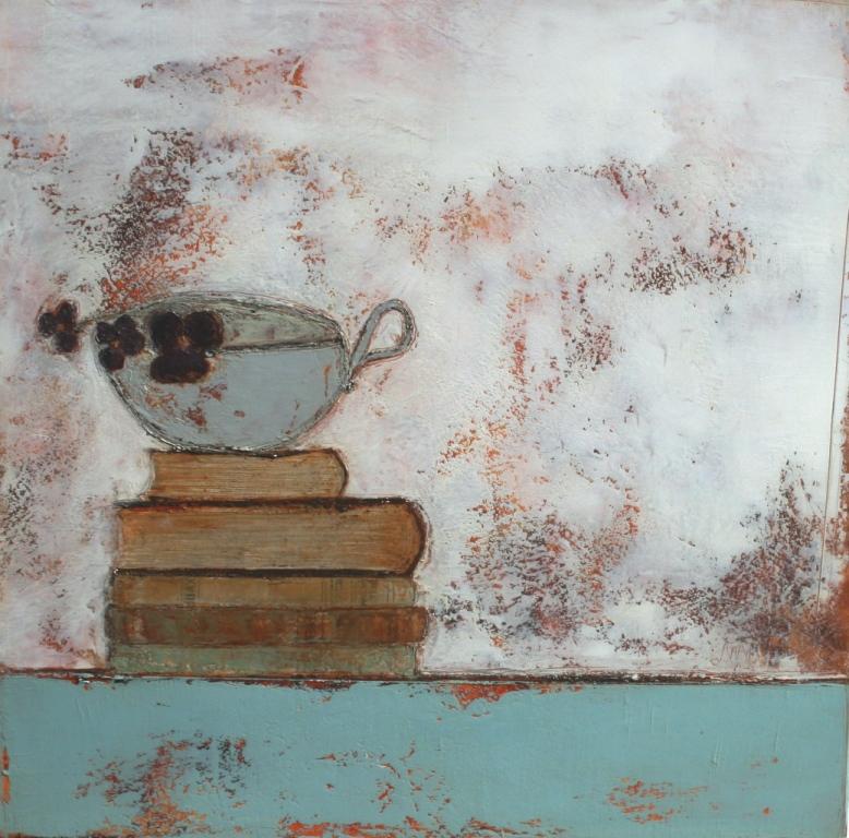 Painting: Books,Cup and Flowers