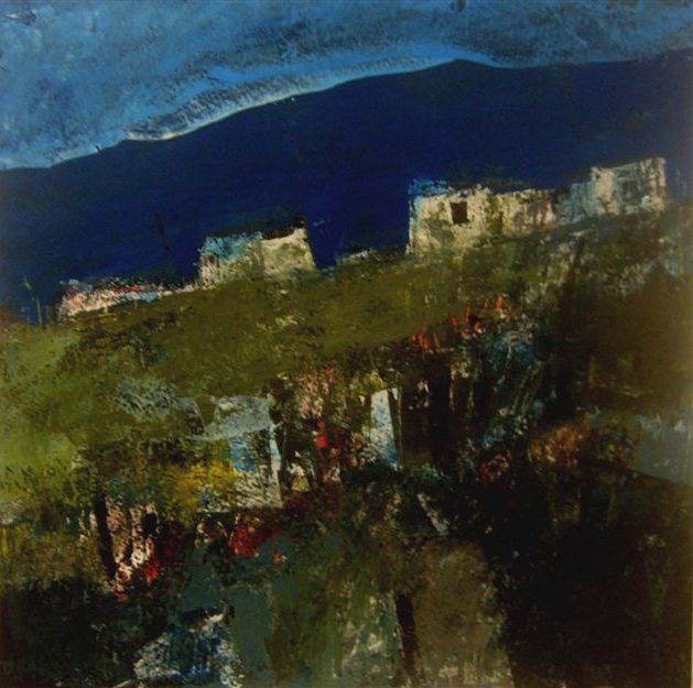 Painted in acrylic the image is strong with bold colours and clear brushstrokes. The cottages are starting to merge with the colour of the landscape under the weight of dark hills beyond and a strong blue sky.
