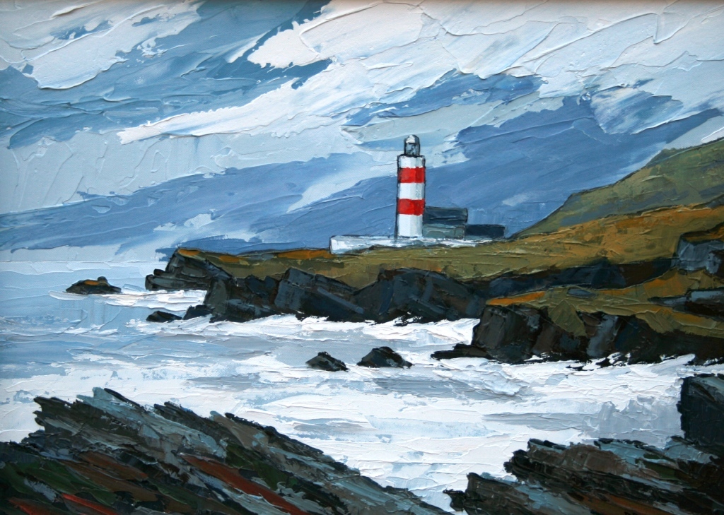 using a thick impasto technique to produce bold strokes that add strength and texture to his paintings, giving it a sculptured feel. This painting style adds to the contrast between colour, light and shade in David Barnes' work and the power of the natural elements on Bardsey.