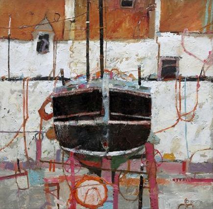 David Smith finds inspiration in the colours and scenes of the east coast of Scotland. In 'Black Boat, Fife Coast' he has used a warm palette with colours and shapes one might expect to see in a rock pool. There is a real sense of the boat being part of the landscape, inextricably linked to the ebb and flow of Scottish coastal life.