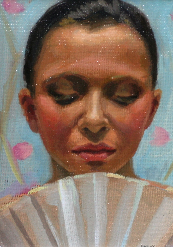 A serene face is positioned against a colourful floral wall paper. The fan and the downward gaze seem to communicate an underlining need for distance from others. This reluctance to engage is further reinforced by the fan which acts as a barrier. This maybe a brief acquaintance but not one that will easily be forgotten