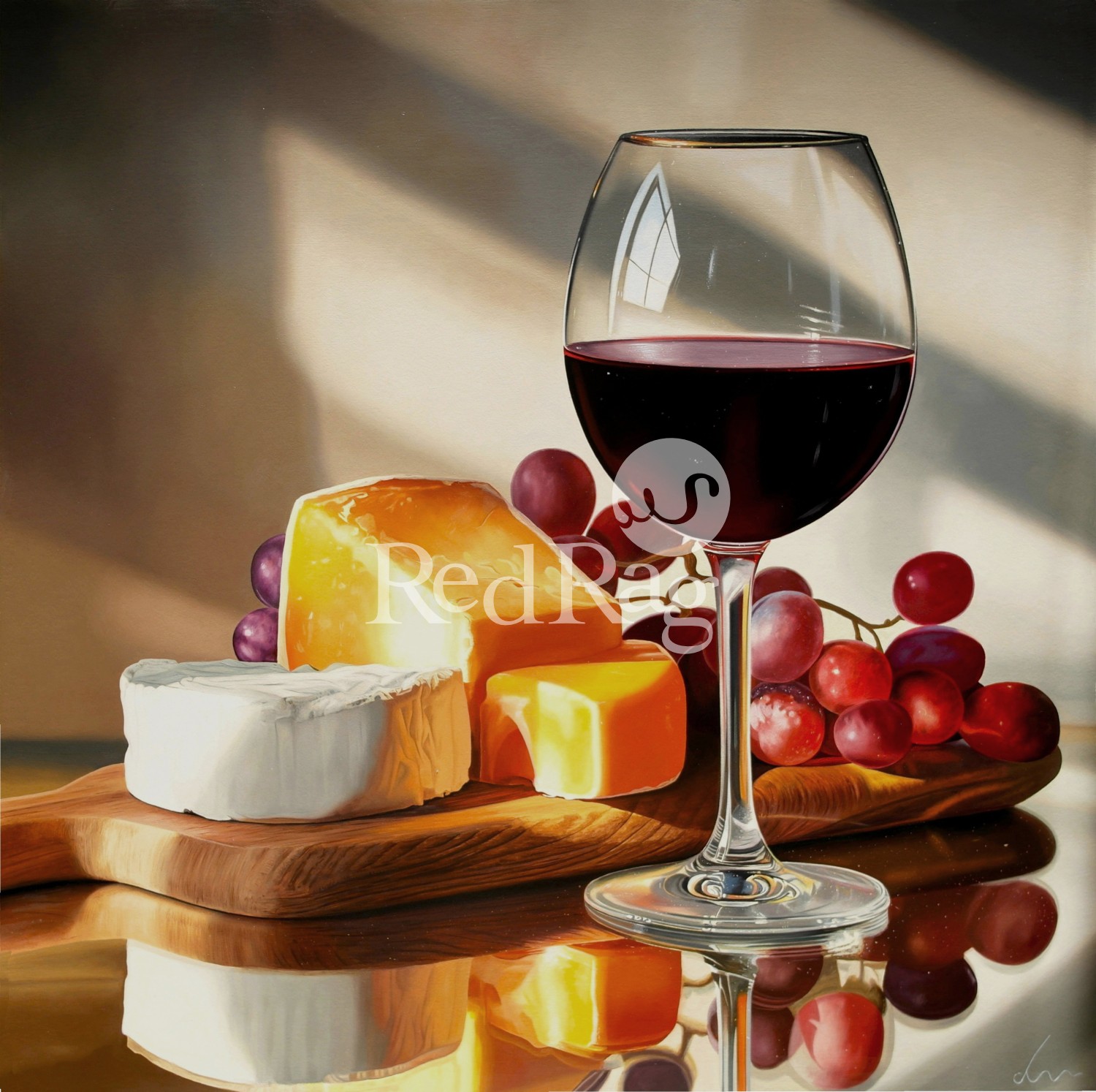 together a glass of red wine and a carefully arranged selection of cheese, each element rendered with the luminous glazing and precise surface control characteristic of de Bono’s work. His use of chiaroscuro creates a sense of quiet theatre, allowing the objects to emerge from a restrained, shadowed ground with jewel‑like intensity. The painting draws on the traditions of Dutch Golden Age still life, yet its crisp edges, balanced geometry, and contemplative stillness give it a distinctly contemporary presence. De Bono’s interest in elevating everyday luxuries into meditative visual statements is central to his practice, and this piece forms part of a broader series exploring wine, fruit, and fine foods. Within that context, Fine Cheese with Red Wine stands out for its harmony of colour, its interplay of texture and reflection, and its intimate, inviting scale.