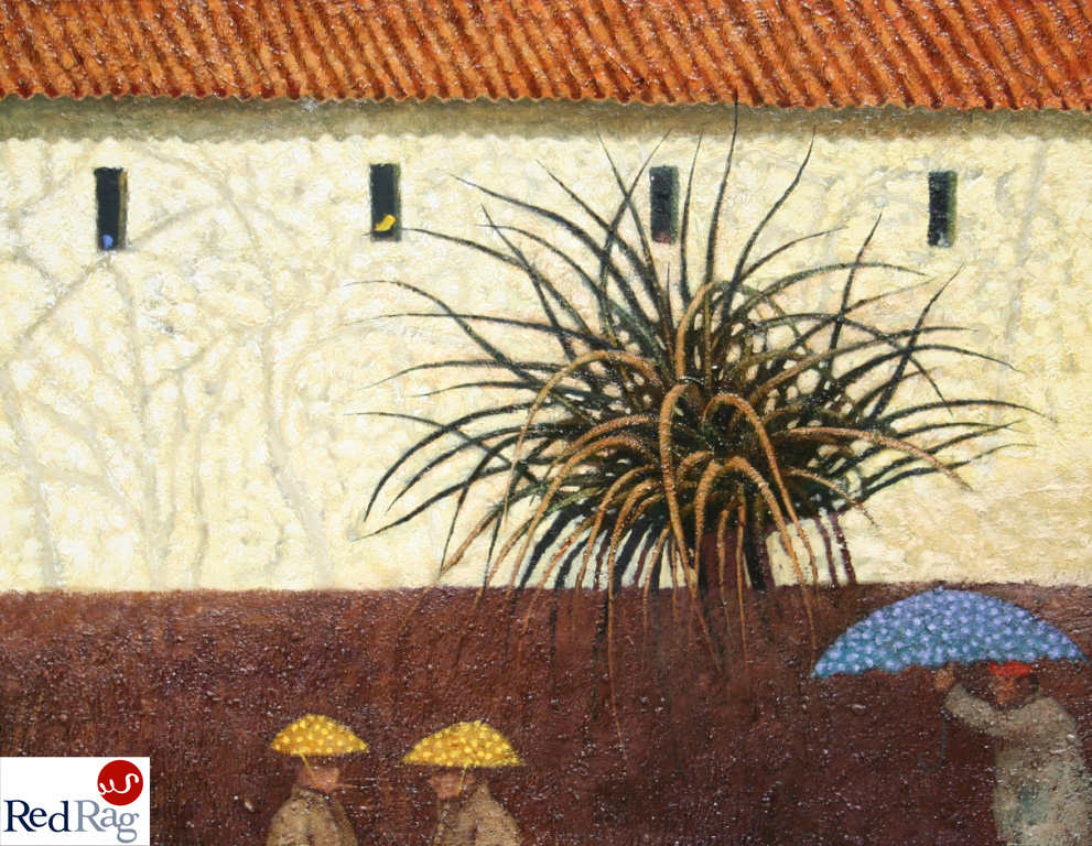 Light and atmosphere are always a compelling combination in Simon Garden contemporary paintings. And, Simon is always fascinated by shapes. In 'Fantastic Hats' we see a classic range of his interests and talents. The plant provides a sense of movement, mystery and geometry against the hot textural walls of the building. The people in the foreground are shaded and partly hidden - are they hiding from the sun or from what lies behind the windows?