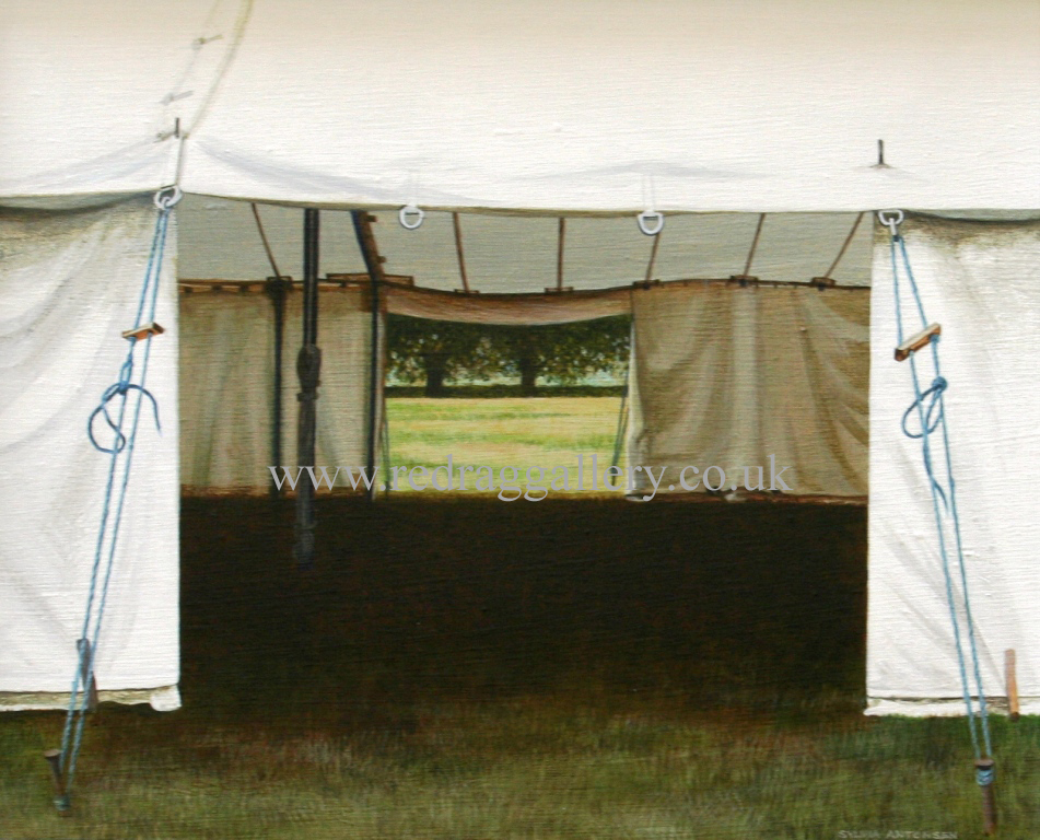 and empty, framing a view beyond the tent itself. Each fold of tent canvas and blade of grass is carefully rendered, giving us a heightened sense of realism and expectation. Antonsen's skill in balancing the composition lends a sense of calm and order to the painting.